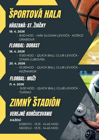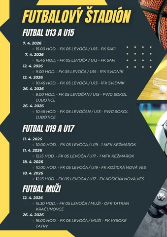 - apríla 2026 — 30. apríla 2026 Pozývame vás na domáce zápasy našich futbalových družstiev U13, U15, U17, U19 aj mužov, hádzanárske a florbalové stretnutia! Príďte povzbudiť naše tímy a užite si skvelú športovú atmosféru na futbalovom štadióne, v športovej hale i na zimnom štadióne! Podrobný program nájdete na plagátoch. Vstup voľný!